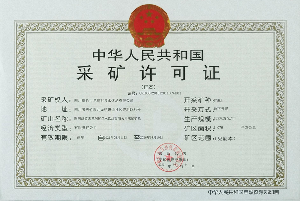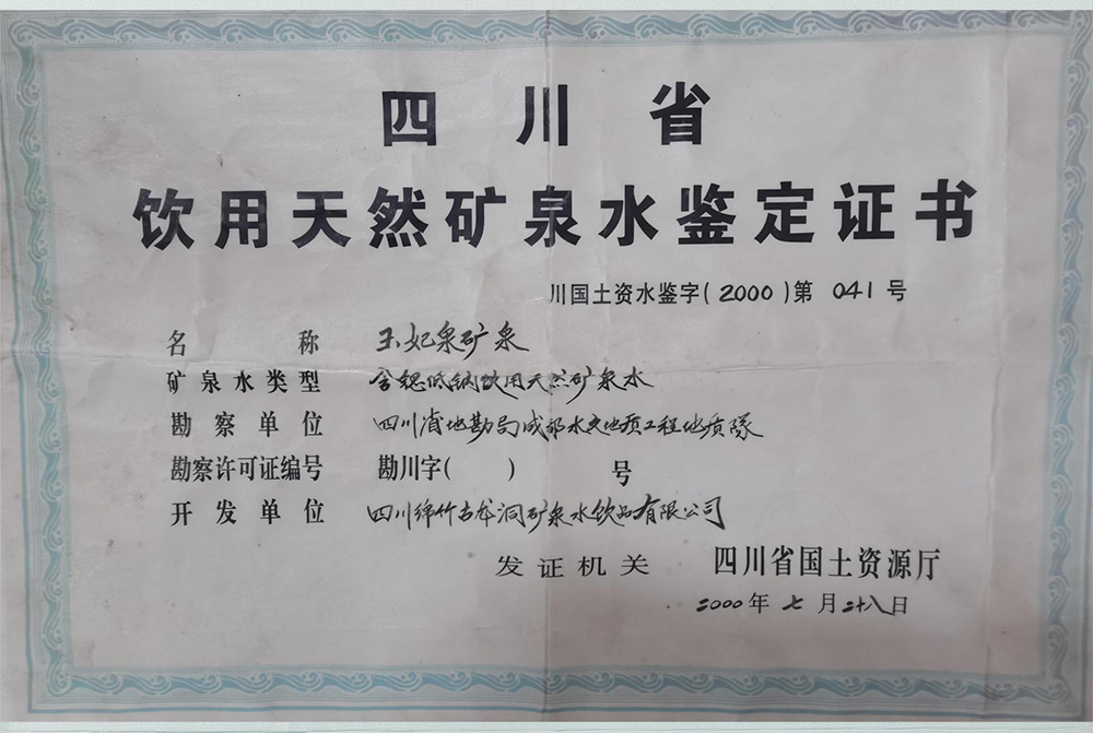 产品水源地取自“中国名泉——玉妃泉”,从地下深处自然涌出和开井采集。玉妃泉受四川盆地西缘龙门山断裂地震带控制,出露于侏罗系灰质砾岩溶洞,泉水自洞中潺潺流出。水温及洞温常年分别保持在13℃和16℃,稳定流量为1154立方米/日,矿化度为0.16克/升,泉水以含锶、钠为主要特征,属最低钠的锶HCO3-Ca型水,泉水中还含有锌、锂、偏硅酸、二氧化碳、硒等对人体健康有益的化学成分。